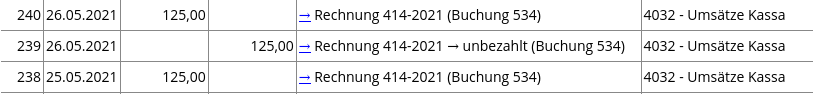 Danach wurde die Rechnung wieder zurück auf „bezahlt“ gesetzt, wodurch wieder ein Eingang von 125 € im Kassenbuch eingetragen wurde (Beleg 240).
